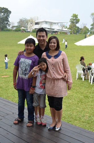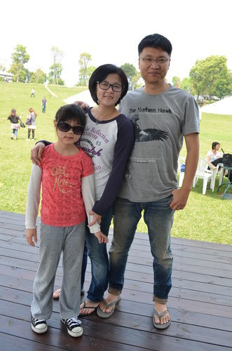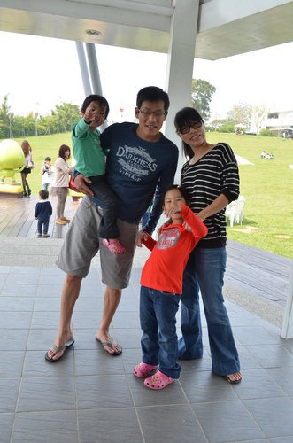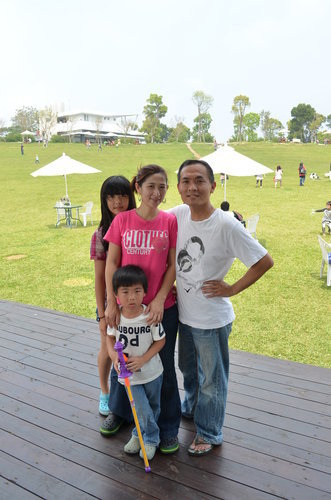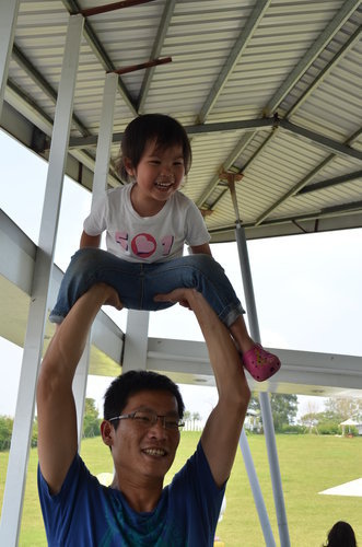 爸爸在風不大的草地上放超大立體風箏.當然風不起來呀